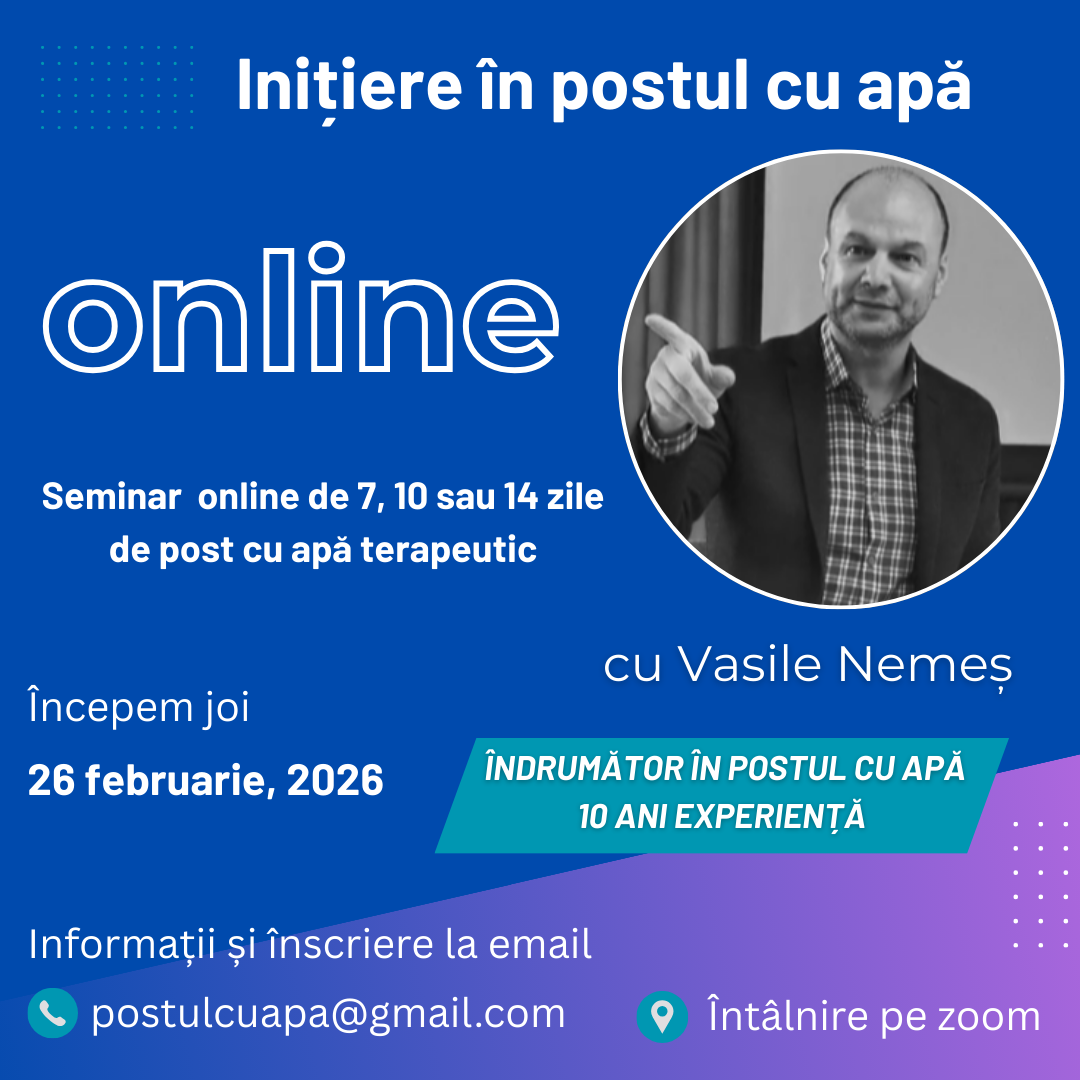 Sau e posibil acum și consultanță online cu mine, despre inițierea și susținere în postul cu apă terapeutic, la email postulcuapa@gmail.com sau pe Whatsapp 0757621806